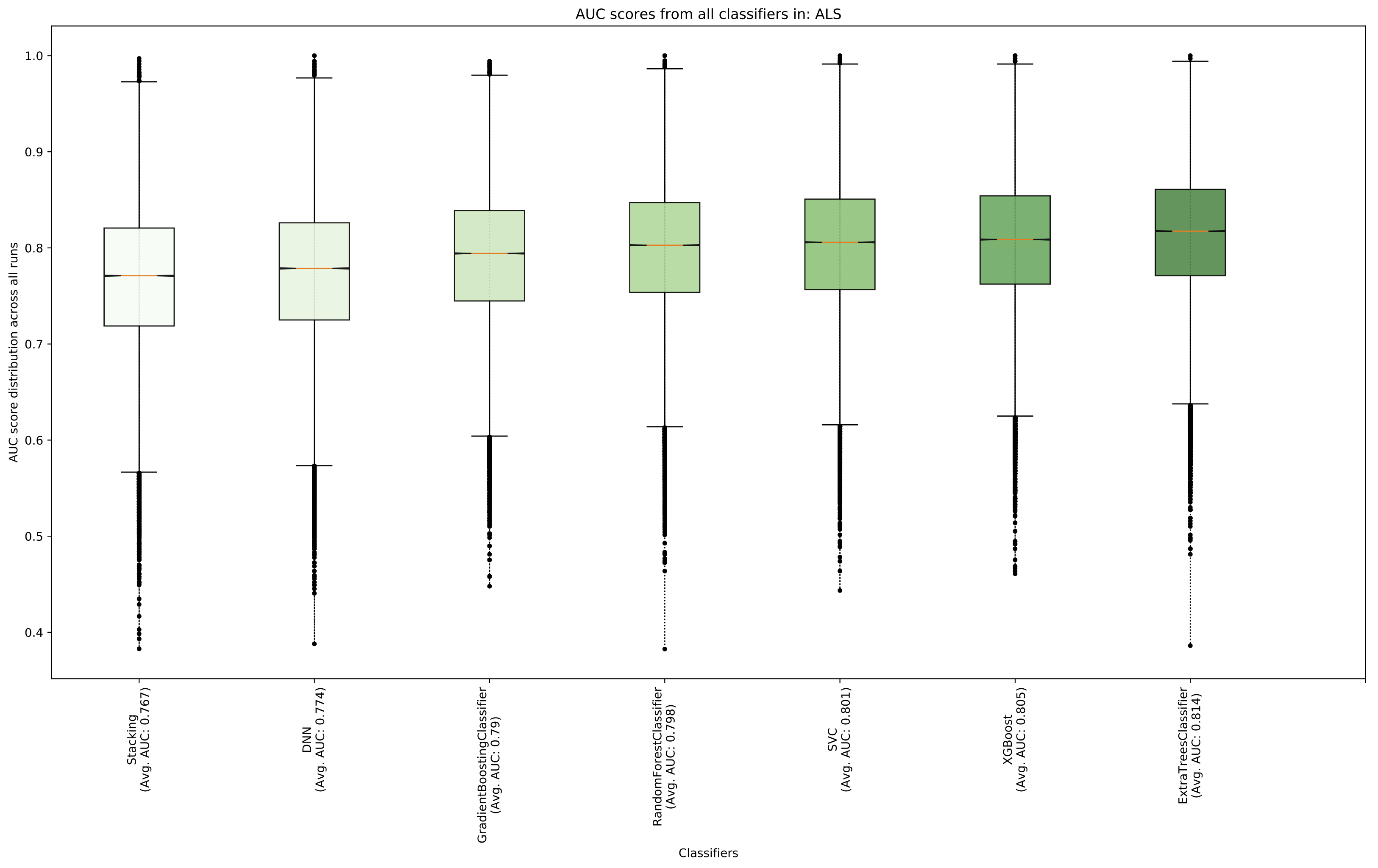 distribution of AUC performance scores per classifier.